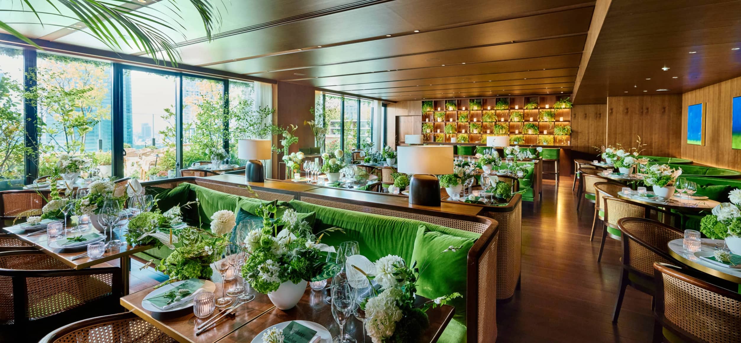 挙式の直後、そのままの流れで移動できる「The Jade Room」は、光と緑に囲まれた空間。自然と一体になるような感覚の中で、上質な料理と会話を楽しむことができます。滞在の延長にあるような、心地よさと非日常のバランスが魅力です。